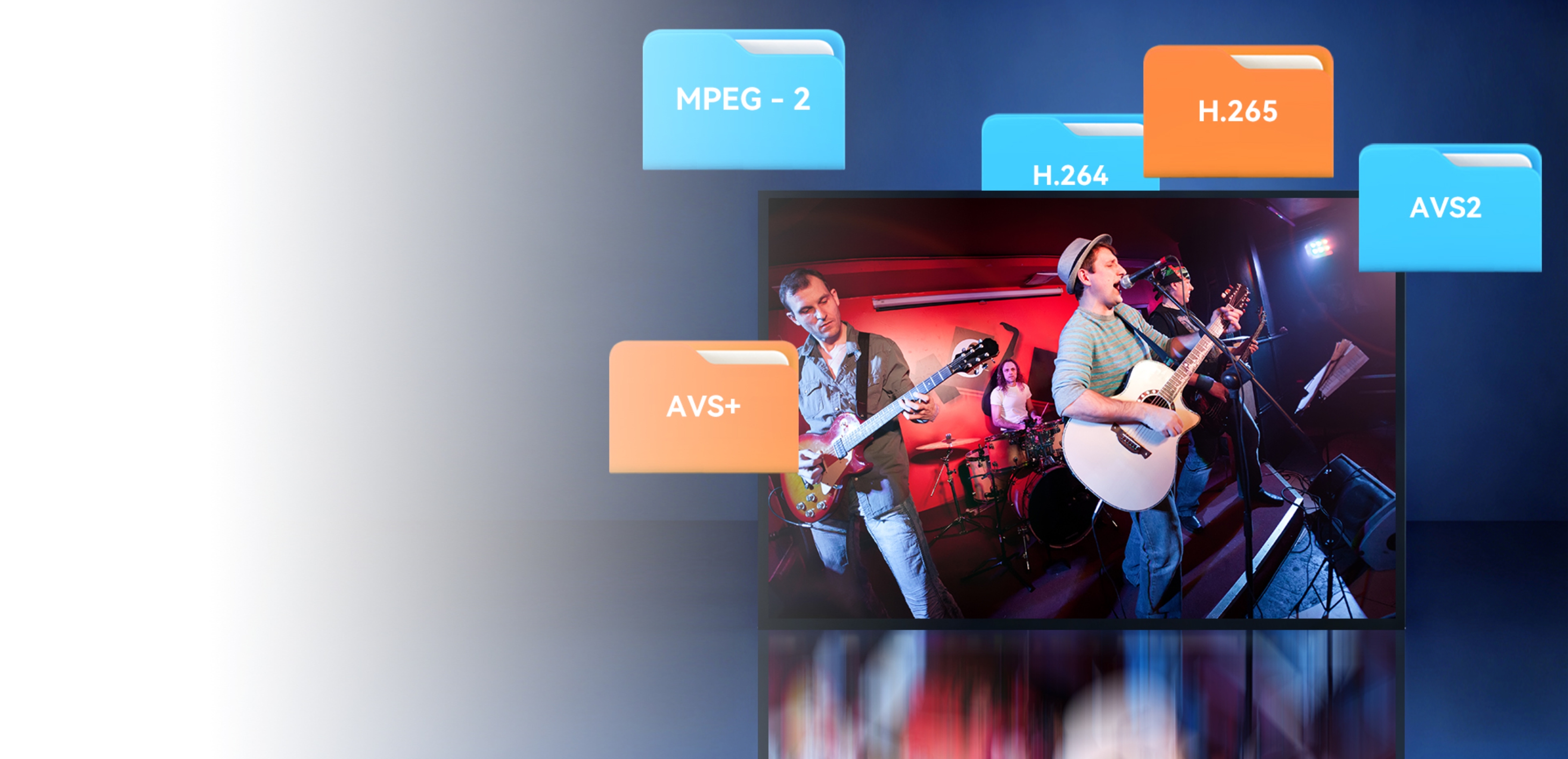 支持 MPEG2、MPEG4 AVC(H.264)等标清 / 高清、4K UHD (3840 x 2160)解码格式,涵盖 MPEG2 SD 4:2:0 MP@ML、MPEG2 HD 4:2:0 MP@ML、MPEG4 AVC SD MP@L3 及 MPEG4 AVC HD MP@L4.0/HP@4.0,可处理多种分辨率信号,适配不同场景需求